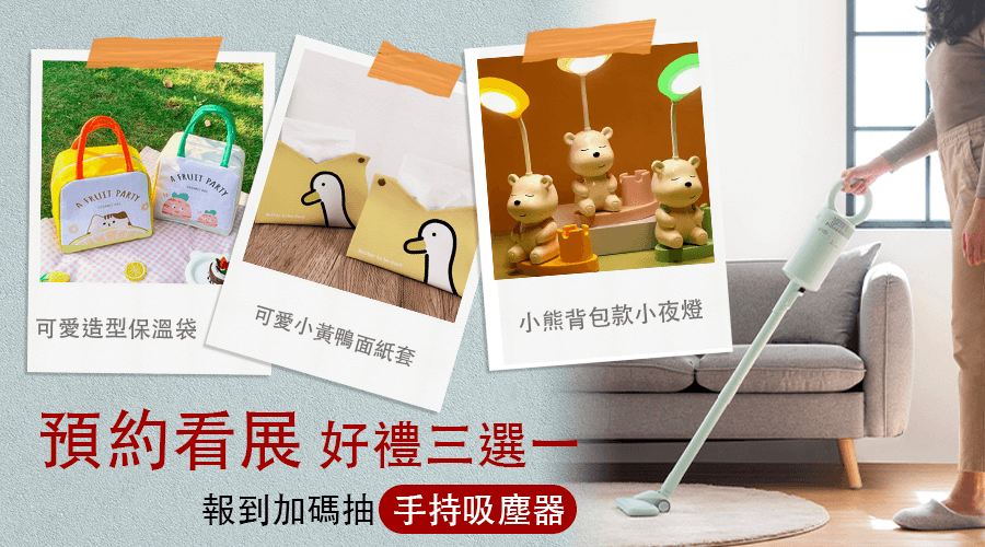 凡線上預約看展,現場報到即送「可愛小黃鴨面紙套、小熊背包款小夜燈、可愛造型保溫袋」好禮三選一乙份,限量200份,數量有限,要搶要快