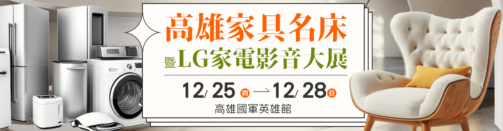 「高雄家具名床曁LG家電影音大展」,即將在12月25(四)至12月28(日),盛大展出。 優質商品、完美品質,裝潢設計、實木家具、各式風格沙發、舒壓名床、健康電動床等商品一應俱全,不管是除舊佈新或新家整體規劃,這裡都能一次滿足您的所有需求!打造舒適生活,就在「高雄家具名床曁LG家電影音大展」